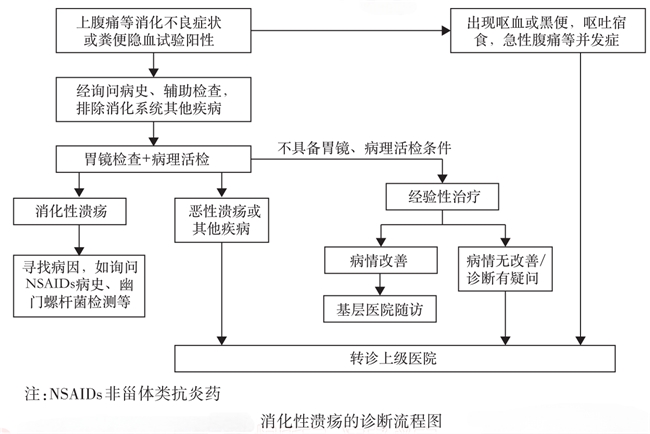 消化性溃疡患者的临床症状、体征缺乏特异性,确诊必须依靠胃镜及病理学检查。消化性溃疡的诊断流程见下图