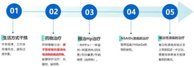 治疗目的在于除去病因(根除Hp、尽可能停服阿司匹林或其他 NSAIDs、戒烟等),消除症状,愈合溃疡,防止溃疡复发和避免并发症。